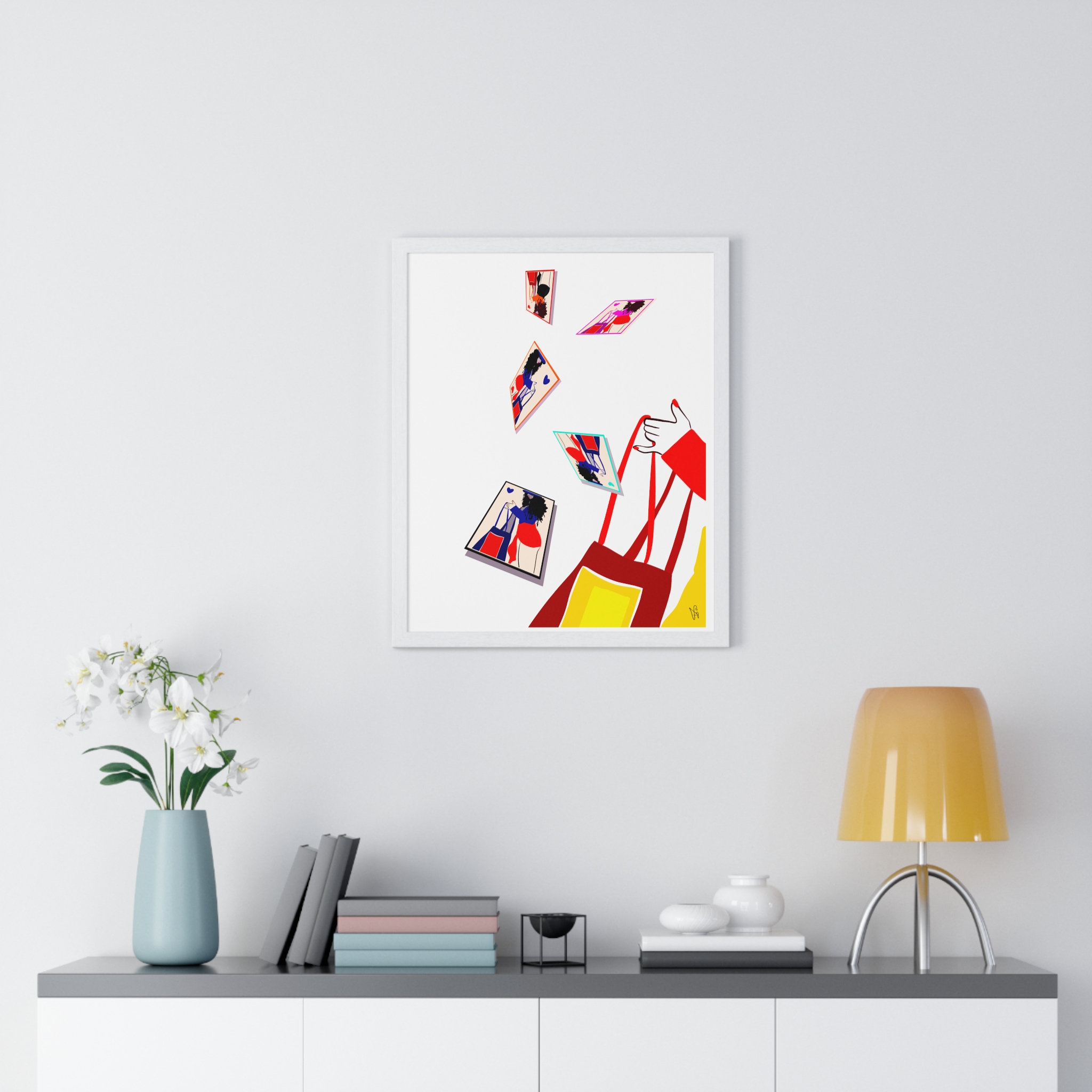 – Available in sleek black or white wooden frames